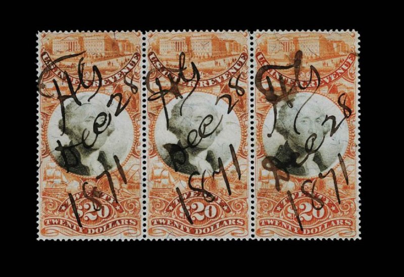 1784 O R150 image#R150, $20.00 Orange and black, a rare horizontal strip of three of this scarce high value in surprisingly nice quality, being free of the myriad faults that typically plague these large stamps, beautifully centered throughout, bold "Dec 28, 1871" ms. cancels, though reported as being first issued on Feb. 26, 1872, extremely fine for a multiple of this; the finer of only two known horizontal strips of three; cataloged as a pair and single; ex-Eagle and Joyce. (Image) 1,575.00+