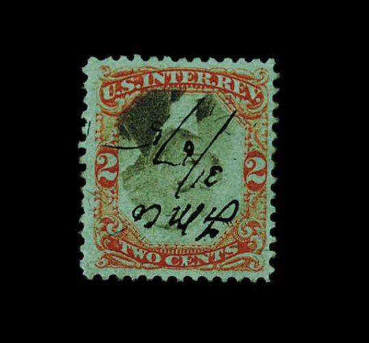 1785 O R151a image#R151a, 2c Orange and black on green paper, Inverted Center, highly select used example of this scarce stamp, exceptionally well centered, strong rich colors, neat manuscript cancel, extremely fine; 2001 PF certificate; ex-Zoellner. (Image) 350.00