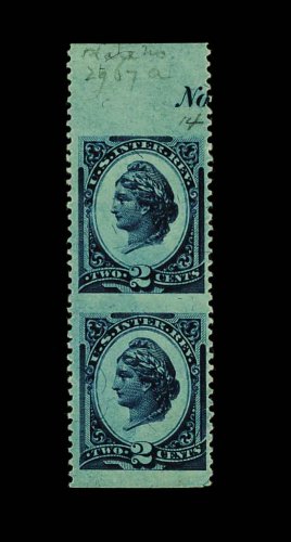 1786 og R152d image#R152d, 2c Blue on blue, vertical pair, imperforate horizontally, a choice mint top sheet-margin pair of this seldom seen error, quite fresh and well centered, full o.g., l.h., blue seal handstamp on reverse as is always the case, very fine; considerably undercataloged considering how infrequently this is offered; 1999 PF certificate; ex-Lyons. (Image) 400.00