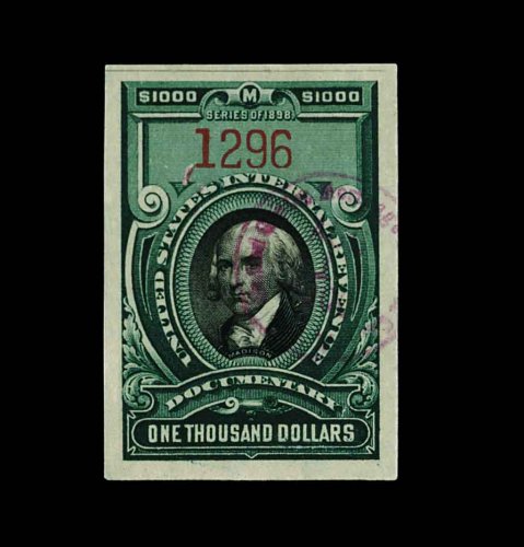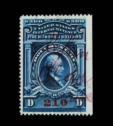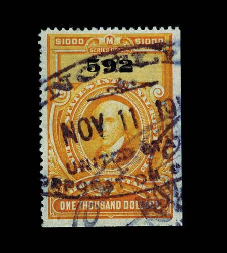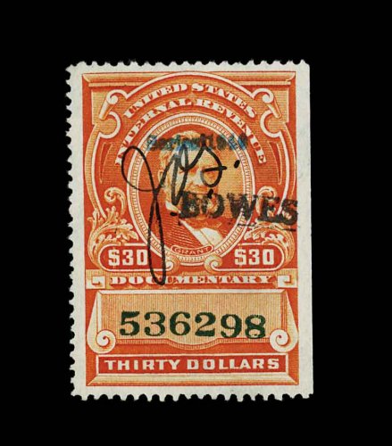 1789 O R158A image#R158A, 1c Dark yellow green, "Chapman" provisional overprint, an extraordinarily choice example of this provisional revenue rarity, of which only 250 were issued, with government approval, for the private use by the Chapman Steamboat Line, which operated steamboat freighters along the Erie Canal; exceptionally well centered and margined, particularly when compared to the existing population, strong rich color and impression, very light and unobtrusive July 8, 1898 handstamp cancel, very fine; an enormously rare sound example of the Chapman overprint; in Larry Lyons census, he records only fourteen examples, one of which is on a document and fully ten are faulty, leaving only three sound singles available; a stamp that is missing in even the most advanced revenue collections; 1992 PSE certificate; ex-Zoellner. (Image) 8,750.00