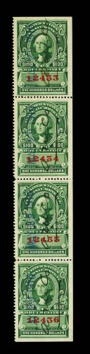 1795 O R225 image#R225, $100.00 Green, vertical strip of four, without usual cut cancel, exceptionally well centered and margined, rich luxuriant color, neat blue handstamp and manuscript cancels, extremely fine; unpriced in Scott as a strip without cut cancels. (Image) Est. 150-200