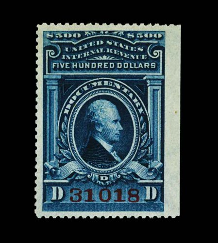 1794 og R189 image#R189, $50.00 Gray surcharged with open numeral "50", an exceptionally select mint example of this scarce value, wonderfully fresh, bright color, well centered, full clean o.g., lightly hinged, choice very fine; seldom seen mint and especially elusive in this premium condition; 2000 PF certificate; ex-Handy. (Image) 700.00