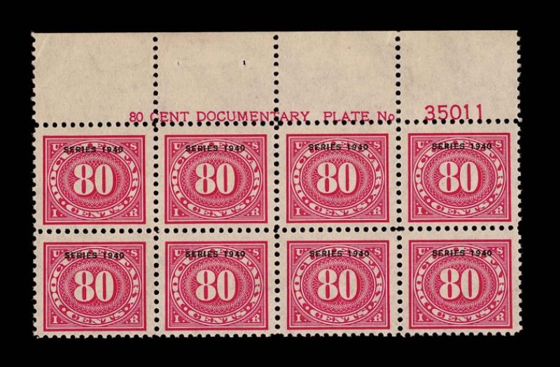 1799 nhX R264-75 image#R264-75, 1c-80c Rose pink, Series 1940 overprints cplt., a remarkable set of full top or bottom imprint and plate number blocks of either six or eight (as appropriate to accommodate full imprint), all quite fresh and each is well centered, o.g., n.h., some natural gum bends throughout, 1c with vertical gum crease in two stamps, 80c with trivial corner selvage crease, overall very fine; an impossibly difficult set to assemble, which would take years to duplicate acquiring them one at a time, especially to locate the key 8c and 80c values; ex-Wampler. (Image) Est. 750-1,000