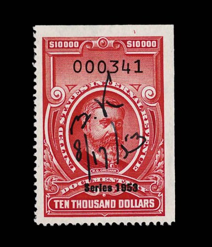 1822 O R653 image#R653, $10,000.00 Carmine, Series 1953, a gem uncut used example of this rare high denomination, neat 1953 manuscript cancel only, deep luxuriant paper, exceptionally well centered amid large margins, extremely fine; one of the very few existing uncut examples of this value, and certainly one of the finest; 2000 PF certificate; ex-Handy. (Image) 2,000.00
