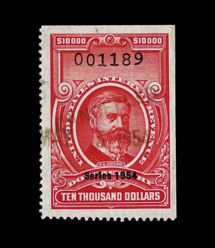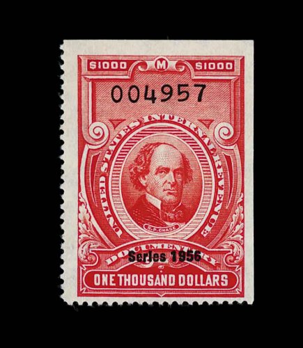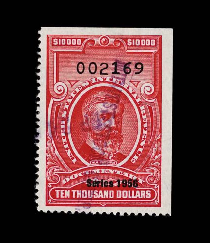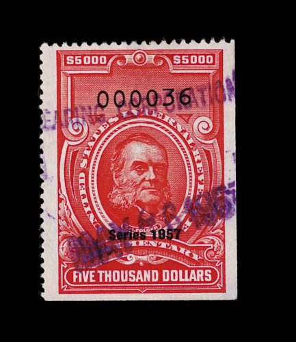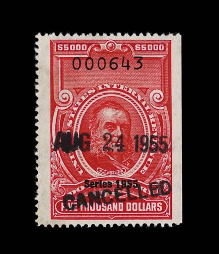 1831 O R704 image#R704, $5,000.00 Carmine, Series 1956, an exceptional used example of this seldom offered high denomination, in a quality which is seen only on very rare occasions, uncut, cancelled neatly with a violet handstamp, marvelously bright and fresh, well centered and margined, choice very fine; one of the rarest of all the "Red" revenues; 1998 PF certificate; ex-Wampler. (Image) 1,400.00