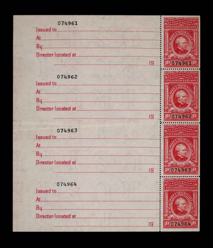 1835 nh R728 image#R728, $500.00 Carmine, Series 1958 without overprint, a most remarkable vertical strip of four still attached to the complete original ledger sheet at left, with matching control numbers, stamps are exceptionally fresh and well centered, o.g., n.h., light horizontal crease in center affecting only the ledger sheet, stamps are extremely fine; the only intact full "sheet" we have ever encountered of a high denomination "Red" revenue. (Image) as singles 340.00+