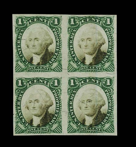 1837 ngbl RB1ac image#RB1ac, 1c Green and black on violet paper, imperforate, choice unused block of four, large even margins all around, strong colors, extremely fine and quite scarce. (Image) 475.00