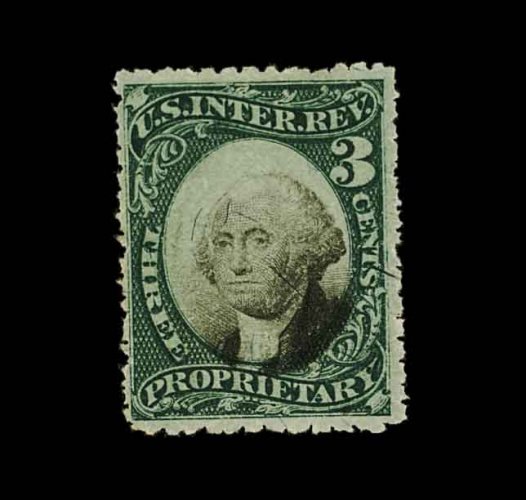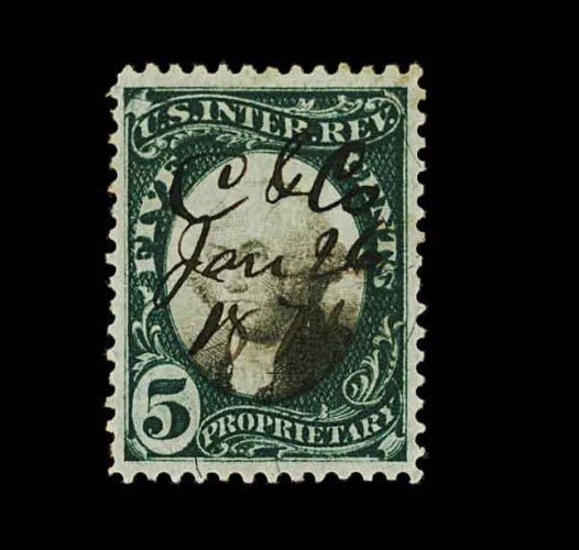 1838 O RB1ad image#RB1ad, 1c Green and black on violet paper, Inverted Center, an extraordinary quality used example of this rarely offered Inverted Center, possessing near perfect centering amid very large margins, plus its colors are strikingly intense, neat "J.P. Mills,/Proprieter,/1874" printed cancel, small corner creases at top left and top right, otherwise extremely fine; Larry Lyons in his census of important Inverted Center revenues records 23 examples of the One Cent Proprietary on violet paper, only five of the existing population possesses very fine or better centering, and of this select group all have faults, a couple being quite serious, the Floyd example has the most trivial of flaws and is, unquestionably the finest recorded example; 1991 PF certificate; ex-Joyce and Zoellner. (Image) 2,500.00