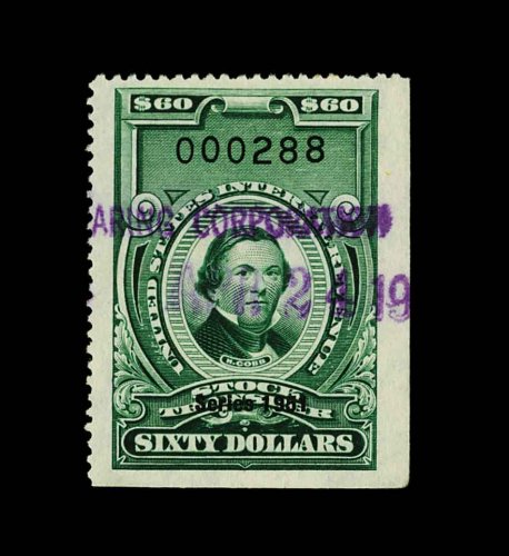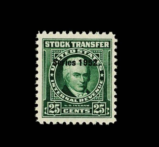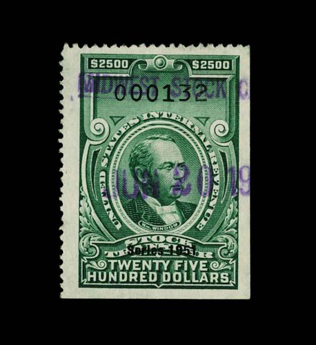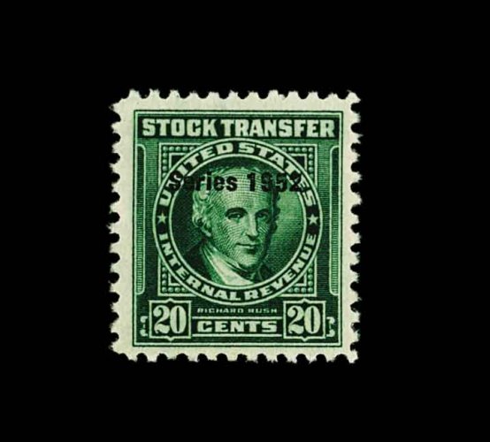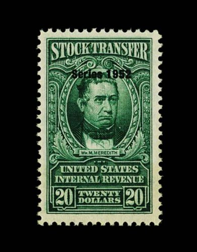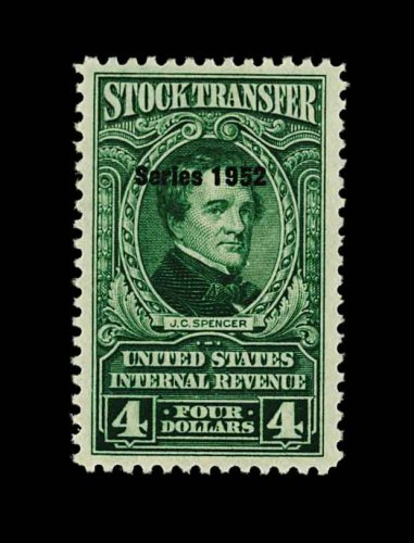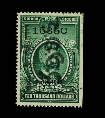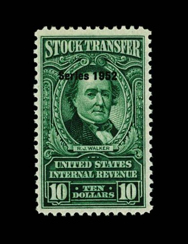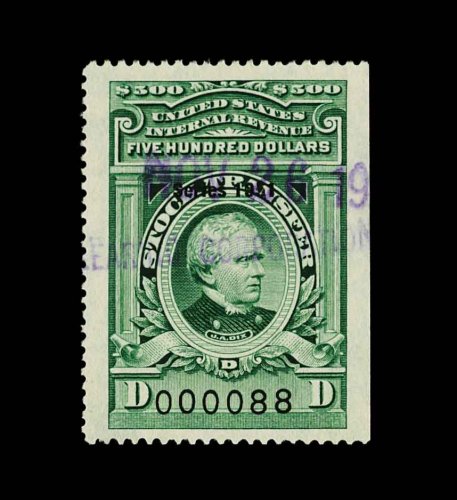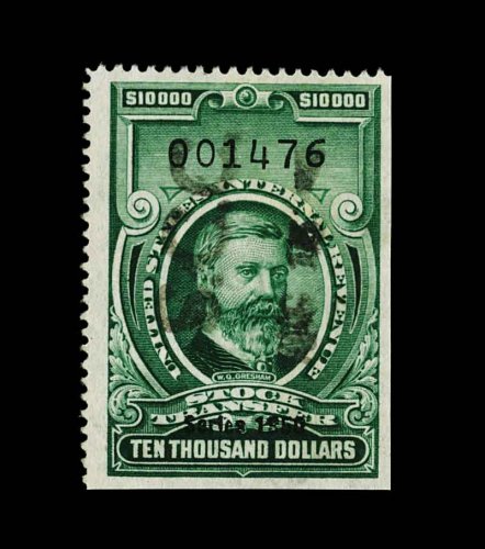 1890 nh RD371 image#RD371, $10.00 Bright green, Series 1952, an incredibly choice mint example of this final issue Stock Transfer rarity that is missing from most advanced revenue collections, brilliantly fresh, o.g., n.h., extremely fine; one of the finest of the mere 79 issued; 1998 PF certificate; ex-Wampler. (Image) for hinged 2,500.00
