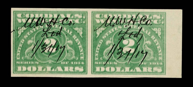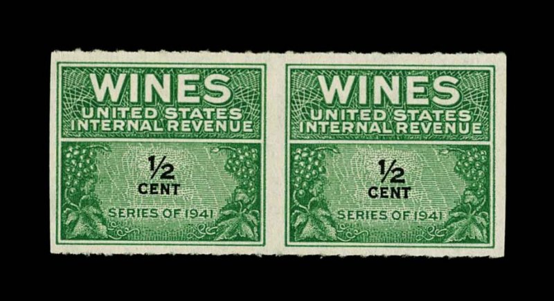1899 og RE110a image#RE110a, 1/2c Green and black, imperforate vertically, horizontal pair, well centered, bright and fresh, without gum as issued, extremely fine; ex-Lyons. (Image) 200.00