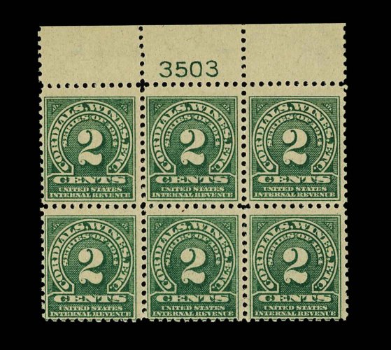 1893 nhX RE31 image#RE31, 2c Green, perforated 11, very scarce top margin plate no. 3503 block of six, quite fresh, strong color, o.g., n.h., fine; even the impressive Wampler collection of plate blocks did not have an example of this; catalogs as singles alone at $480.00. (Image) Est. 400-500