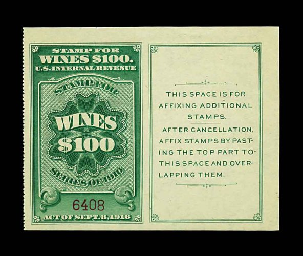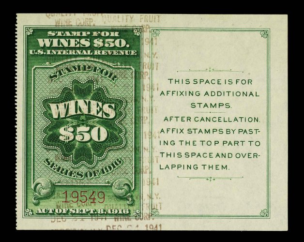 1897 O RE107C image#RE107C, $50.00 Yellow green, a spectacular quality used example of one of the rarest and most difficult of all Wine stamp issues, being in a condition which is clearly among the finest, if not the finest known, without any of the myriad of faults and staining so often associated with these, with full adjoining tablet at right and completely unfolded, incredibly fresh and bright overall, outstanding centering, light and neat overall black handstamp cancel dated 1941 on the stamp itself, tiny perf. dimple area mentioned only for complete accuracy, extremely fine in every regard; a major condition rarity for the revenue collector who takes on the challenge of only acquiring the finest condition available; 2000 PF certificate; ex-Handy. (Image) 1,750.00