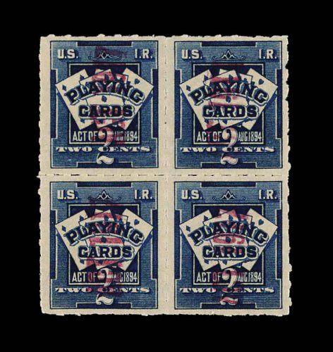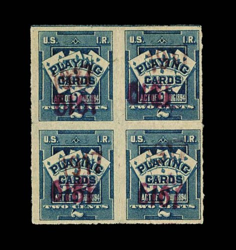 1919 ngbl RF5 var. image#RF5 var., (7c) on 2c Ultramarine, violet "1919" inverted overprint on 1917 Provisional, a very rare unused block of four of this surcharge variety, well centered, rich color, very fine; an important Playing Cards multiple; 2000 PF certificate. (Image) for singles 3,000.00