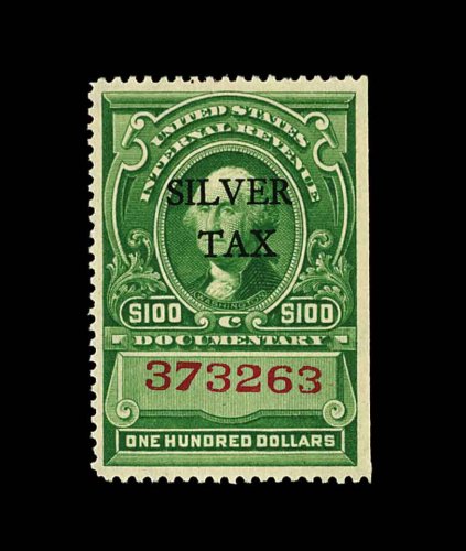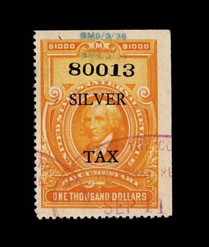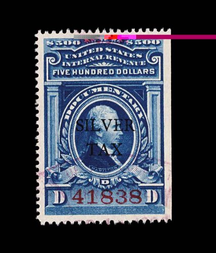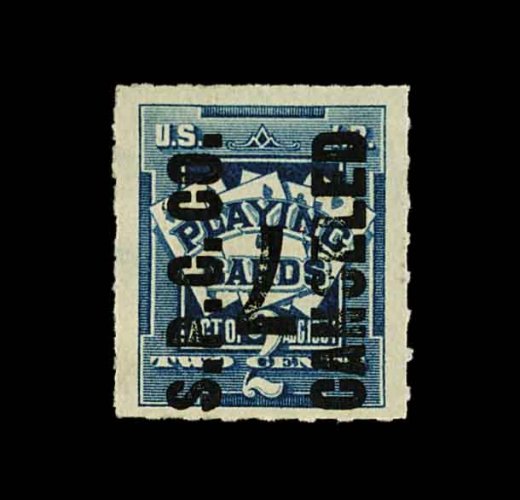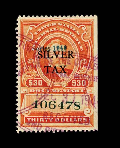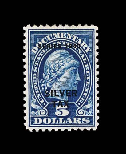 1930 O RG36 image#RG36, $5.00 Dark blue, with "Silver Tax" typewritten overprint, a fresh example of this incredibly rare stamp, quite likely the only known example of this value, deep rich color, nicely centered, neat manuscript date cancel, slight paper penetration from "I" of "SILVER" overprint, very fine; the following is a recent history of this important stamp: being unpriced in Scott, this stamp was acquired by Larry Lyons in our April 1998 sale of the Dr. J. Paul Wampler collection where it realized $6,600.00 (including premium) against significant bidder competition, subsequently, in our January 2000 sale of Mr. Lyon's collection, Mr. Floyd acquired it, again after considerable bidder interest, for $8,800.00 (including premium) when it was priced in Scott at $6,500.00 (based upon Wampler realization); in the most recent edition of the Scott catalog, the editors have chosen not to price it, presumably due to its unique status; an essential stamp for the collector who is attempting to complete his Silver Tax issues; 1998 PF and PSE certificates; ex-Joyce, Wampler and Lyons. (Image) Est. 7,500-10,000