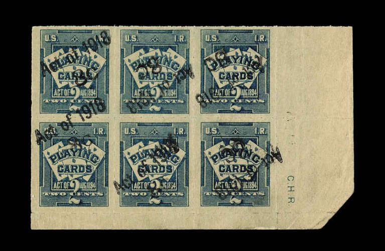 1923 ogbl RF14, 14a image#RF14 var., RF14a var., 8c on 2c Blue, with black "Act of 1918/8c" surcharge, extremely scarce bottom right corner sheet-margin block of six (3 x 2) with engraver's initials, three stamps with normal upright handstamped surcharges, while three stamps have inverted handstamped surcharges, well centered, fresh color, slightly disturbed o.g., bottom right stamp and sheet selvage with minor creases, overall a very fine and impressive multiple, perfect for exhibition; 1999 PF certificate. (Image) for singles 1,200.00+