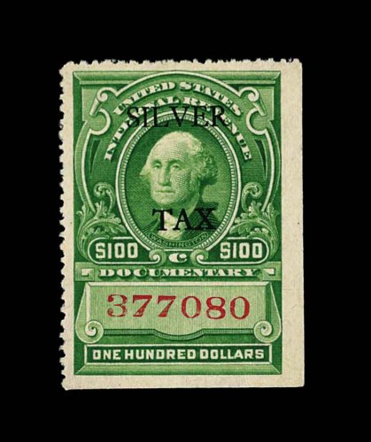 1928 og RG26 image#RG26, $100.00 Green, with wide spacing "Silver Tax" overprint, select unused example, without gum as issued, brilliantly fresh, radiant color, wonderfully well centered, extremely fine; ex-Handy. (Image) 350.00
