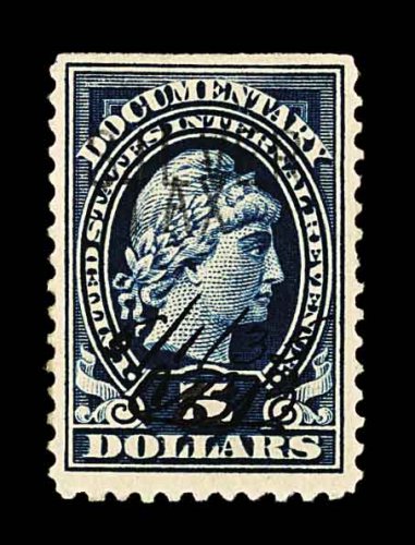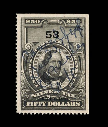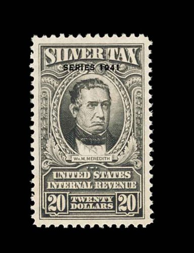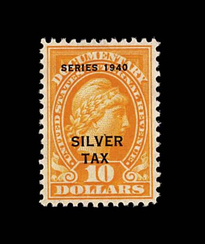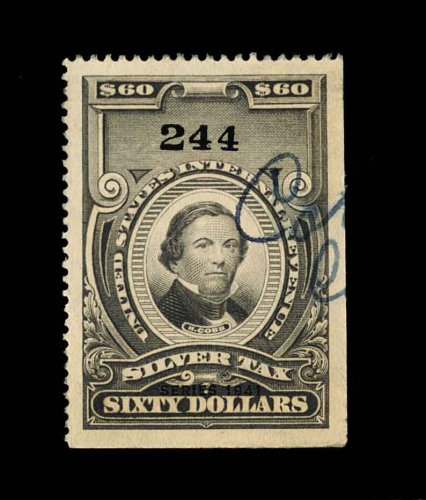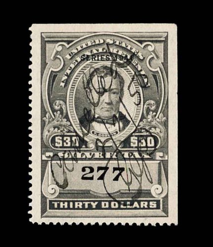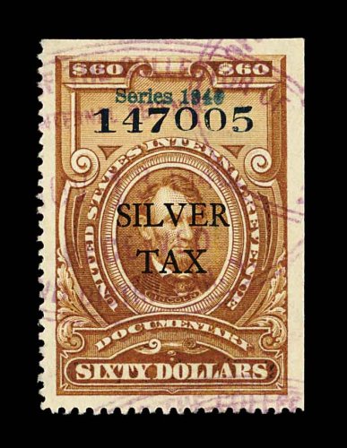 1934 O RG56 image#RG56, $60.00 Brown, handstamped "Series 1940" in blue, a superb used example of this tremendously rare stamp, featuring flawless centering amid extravagantly large margins, strong rich color on bright fresh paper, very light and unobtrusive violet oval handstamp cancels, extremely fine. This stamp is not only one of the key Silver Tax rarities, but is also one of the rarest stamps in all of United States philately, with only four recorded examples - all of which are used. In the past twenty years, three of the four examples have appeared in auction. In 1980, one not quite as well centered as the Floyd copy was sold as part of the important collection of United States revenues formed by George T. Turner (Daniel F. Kelleher Co., Inc. - sale #546), and it is the only one of the four to be accompanied by a PF certificate. A second example appeared eleven years later in the massive 1991 Joyce sale. Both the Joyce and Floyd examples are perfectly centered. This third copy appeared a few years later in a Michael E. Aldrich sale, where Larry Lyons acquired it for $13,000.00, after fierce bidder competition. In the sale of Mr. Lyons' collection by this firm in January 2000, Mr. Floyd was the ultimate winning bidder, again against considerable competition, for $22,000.00, plus the 10% buyer's premium. An exciting opportunity for the serious revenue collector, Silver Tax specialist or for the collector of Lincoln related items who is seeking a highlight for an award-winning exhibit. Accompanied by a 1994 PSE certificate (the only one certified by the PSE). (Image) 15,000.00