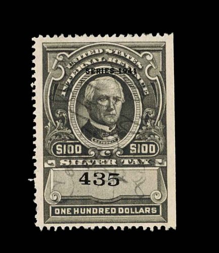 1927 og RG1-21 image#RG1-21, 1934 1c-$100.00 "Silver Tax" overprints cplt., very scarce set to the $100.00 value, each with bright fresh colors, most well centered, o.g. (the three top values without gum as issued), some n.h., fine-very fine or better; ex-Handy. (Image) 859.50
