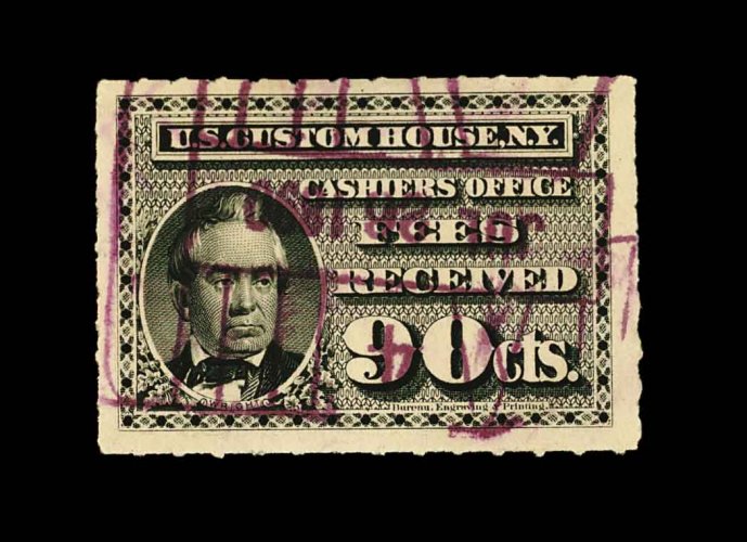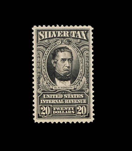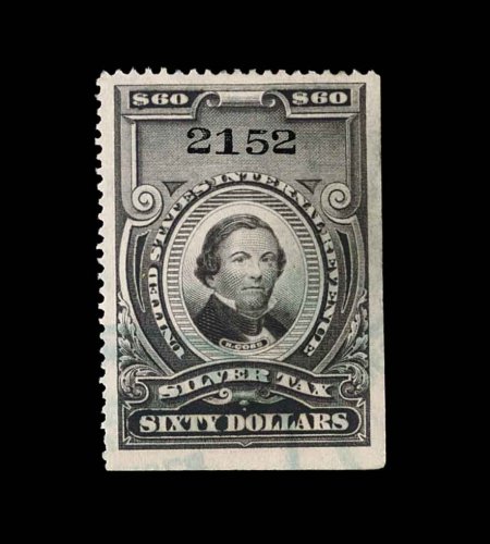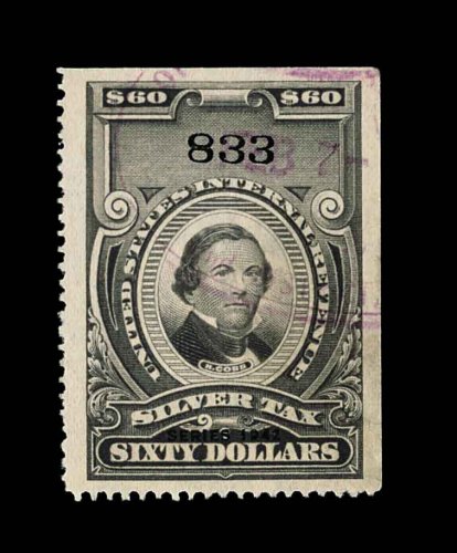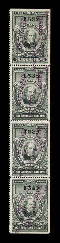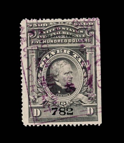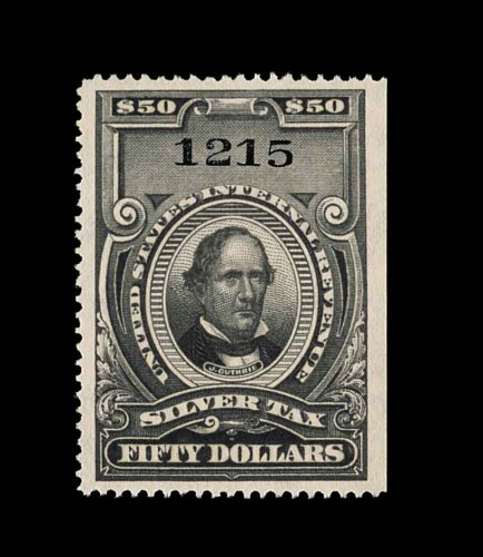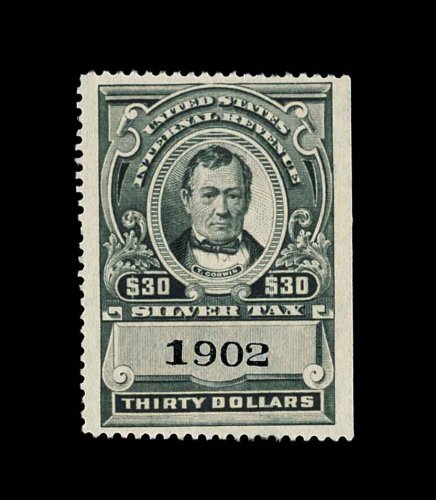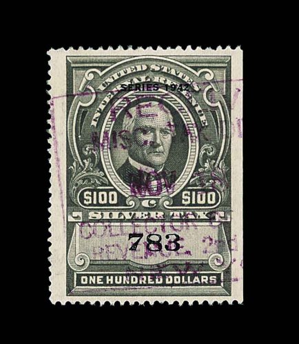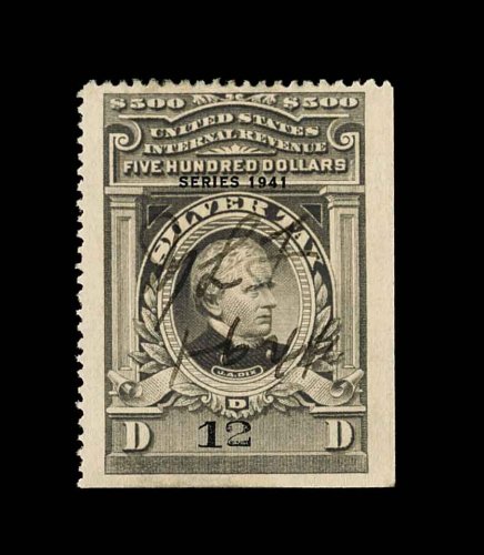 1941 O RG81 image#RG81, $500.00 Gray, Series 1941, serial #12, neat and unobtrusive manuscript cancel, marvelously well centered within large margins, strong color on fresh paper, very fine and choice. A wonderful example of one of the rarest of all the Silver Tax stamps. We are aware of only three examples in existence and all are used. The first was the serial #6 example sold in our April 1998 auction of the Dr. J. Paul Wampler collection, which was originally part of the Joyce collection. It realized $8,800.00 versus a then catalog value of $5,000.00. A second copy, serial #8, was sold as part of the Robert H. Cunliffe collection in 1994 (Daniel F. Kelleher Co., Inc. - sale #596A) and realized $9,900.00. This third example was part of the marvelous collection formed by Larry Lyons, whose collection we were privileged to sell in January 2000. Mr. Floyd acquired the stamp in the Lyons sale for $22,000.00 (including premium), against a then catalog value of $9,000.00. It is unlikely that either of the two stamps just mentioned will become available for quite some time. Therefore, the chance to acquire the Floyd copy may prove to be the only opportunity for many years to own the cornerstone Silver Tax rarity. Accompanied by a 1992 PSE certificate. (Image) 17,500.00