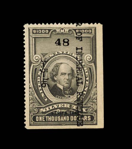 1942 O RG82 image#RG82, $1,000.00 Gray, Series 1941, a choice used example of this very rare stamp, of which only seven examples are known to us, six of which are used, with neat typewritten cancel, unusually well centered within large margins, trivial corner crease at top left, otherwise extremely fine; 2000 PF certificate; ex-Handy. (Image) 2,500.00