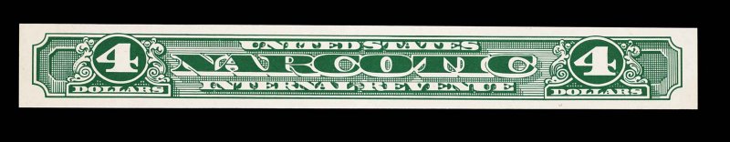 1955 ng RJA104a image#RJA104a, $4.00 Green, imperforate, unwatermarked, a gem unused example, brilliantly fresh, with four lavishly large and symmetrical margins, extremely fine; very rare, especially unused; priced by Scott only used; ex-Wampler. (Image) for used 1,000.00