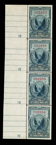 1960 og RY4 image#RY4, $200.00 Dull blue and red, Ty. II, very scarce full sheet of four, printed in a vertical format with ruled sheet-margin at left, serial numbers 2053-56, unused, without gum as issued, bright and fresh, a very fine and choice example of this scarce intact sheet; ex-Wampler. (Image) for singles 2,400.00+