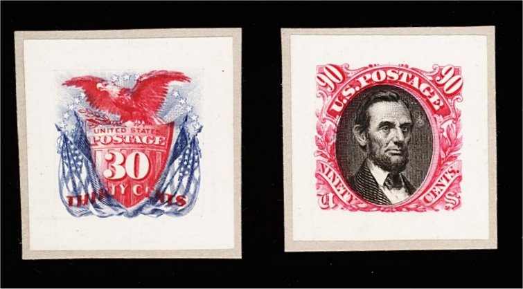 197 P 112P3-22P3 image#112P3-22P3, 1c-90c 1869 Pictorials, plate proofs on india cplt., a wonderfully select set featuring large margins and radiant colors throughout, includes both types of the 15c value, extremely fine; lot also includes the 30c Burgoyne plate essay in black on india paper (#121-E1q), with four margins, faint hinge translucency. (Image) 1,405.00