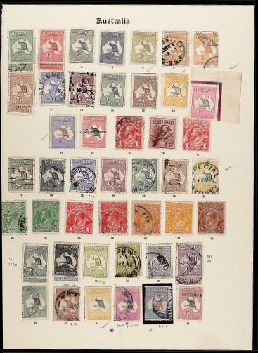 2016 ogOblc Australia specialized mint and used collection to 1960 neatly mounted on album pages, many issues well represented in a specialized format, replete with shades, multiples, perforations, varieties, and cancellation interest, commencing with a noteworthy section of Kangaroo issues, which includes 1913-14 3p Olive Die II mint, 2/- mint and block of four used, 5/- mint (2) and used (2), and 10/- to £2 with "Specimen" overprint mint and perforated telegraph cancellations with punch holes, 1915 (Jan. 15-Aug.) 2/- mint and 5/- mint and used (2, one with watermark inverted), 1915 2/- mint, 5/- mint and block of four used, 10/- mint and used, £1 used, and £2 with "Specimen" overprint mint (2) and used, 1929 (Feb.)-30 5/- mint and 10/- and £2 with "Specimen" overprints mint, 1932 5/- block of six used and £1 used, then continuing with commemorative issues from 1927 which include 1932 Sydney Bridge 5/- used (2), 1937-43 Definitives perf. 13 1/2x14 or 13 1/2 1/2p to £1 mint, a very extensive section of Postage Dues including 1902 values to 8p (2) mint and perf. 11 1p used, 1902-04 10/- with "Specimen" overprint mint, 1906 1p to 6p bright green mint, 1907 1p to 6p dull green mint, Officials, Airpost with flight covers, World War II, British Commonwealth Occupation Force 1/2p to 5/- set in singles and blocks of four mint, used (2 sets, with covers), two other sets used on separate covers (one is May 8, 1947), and Antarctic; the pages are beginning to show signs of foxing/rust which has not yet really had any significant effect on the stamps, some small faults, but overall fine-very fine; an excellent basis for further specialization and expansion with many unusual items. Est. 4,000-5,000