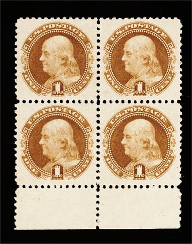 251 ogbl 133a image#133a, 1c Brown orange re-issue, without gum as issued, a gorgeous bottom sheet-margin block of four, brilliantly fresh, deep luxuriant color on bright paper, each stamp in the block with outstanding centering and wide margins, top right stamp with faint and insignificant thin speck, rest extremely fine; 2001 PF certificate. (Image) 1,100.00