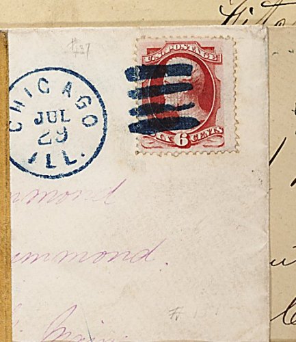 255 c 137 image#137, 6c Carmine with grill, wide margined example with especially strong color and an easily discernible grill impression, tied to clean white cover to Bristol Mills, Maine by superb strike of "Chicago, Ill./Jul 29" fancy duplex cancel in deep blue, addressing written in purple ink which adds to the overall eye-appeal of this scarce cover, torn back flap, very fine; a choice Six Cent grilled Bank Note cover. (Image) 725.00