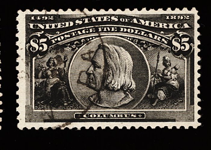 361 O 245 image#245, $5.00 Columbian, an extraordinarily clean and choice used example, being in a far fresher state than most used examples of this high value, with truly prooflike color and impression on immaculately white paper, quite well centered within large margins, additionally its very light and unobtrusive town c.d.s. is much more desirable than the usual large oval registry postmarks which often obliterate the stamp, extremely fine considering this stamp's exceptional overall qualities; 1999 PF certificate. (Image) 1,600.00