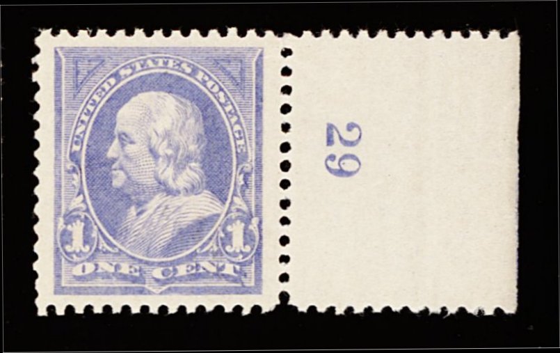 362 nh 246 image#246, 1c Ultramarine, right sheet-margin plate no. 29 single, flawlessly centered amid huge jumbo margins, bright fresh color, o.g., n.h., extremely fine; a striking large-margined gem that is seldom encountered this choice; 2001 PF certificate for a strip of three from which this stamp was taken. (Image) 60.00