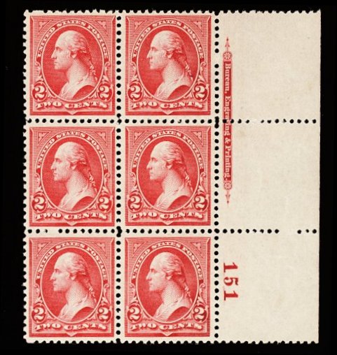 373 nhX 252 image#252, 2c Carmine, Ty. III, a very scarce and wonderfully choice full left sheet-margin imprint and plate no. 151 block of six, being in a condition that is far superior to any other example of a #252 plate block we have ever seen, exceptionally fresh and crisp, bright color, strong intact perforations, unusually well centered (particularly for a plate block), o.g., n.h., very fine-extremely fine; the likelihood of ever encountering a finer plate block of this is highly remote; 2000 PF certificate. (Image) for hinged 1,350.00