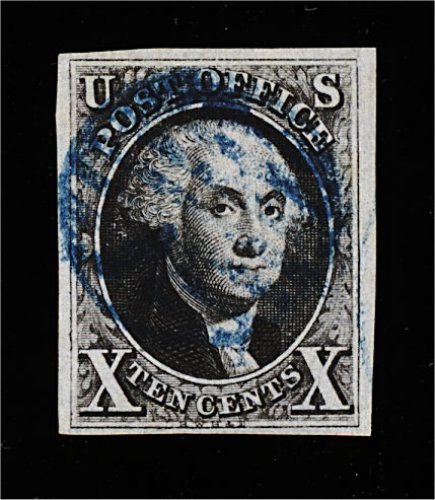 24 O 2 image#2, 10c Black, a most impressive used example, possessing exceptionally large margins all around, strong rich color and an uncommonly detailed impression on fresh paper, attractively postmarked with a blue town c.d.s. incorporating a 10c rate, an extremely fine and striking gem example; 1995 PF certificate; ex-Morris. (Image) 1,450.00