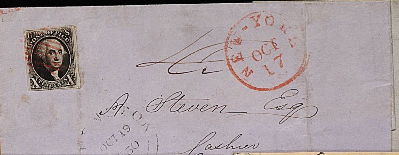 33 c 2 image#2, 10c Black, three large margins, just touching frameline at bottom, strong impression, tied by red grid with matching New York c.d.s. on 1850 folded letter to Hamilton, Canada West, "Queenston U.C./Oct 19 1850" transit pmk., stamp with tiny tear in bottom right margin, otherwise nearly very fine; clear 1981 PF certificate. (Image) 2,100.00