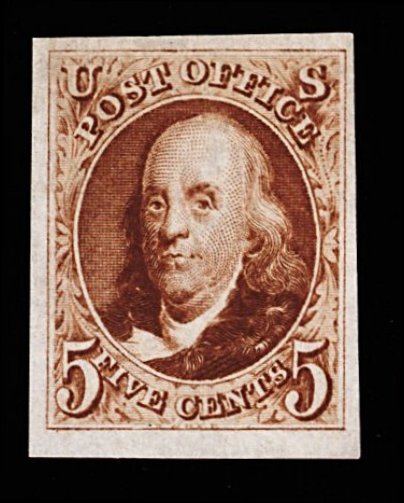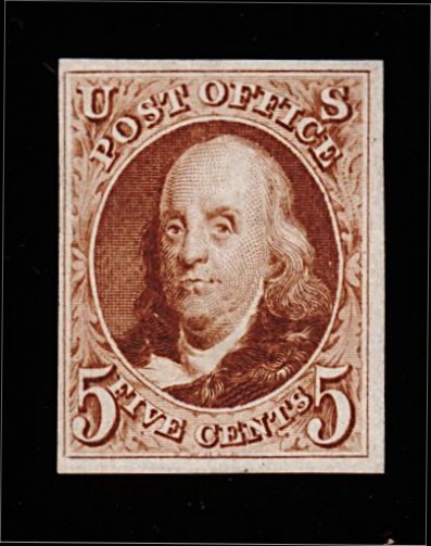 36 og 3 image#3, 5c Red brown reproduction, without gum as issued, a highly select example, featuring four very large margins (quite likely a bottom left corner sheet-margin copy), prooflike color and impression on immaculate paper, an extremely fine gem; 2001 PF certificate. (Image) 850.00