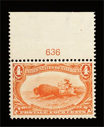 401 nh 287 image#287, 4c Trans-Mississippi, an incredibly choice top sheet-margin plate no. 636 single, beautifully centered amid extravagantly large margins, eye-arresting color that is incredibly vibrant, pristine o.g., stamp n.h., extremely fine; plate no. 636 happens to be a scarcer number on this issue according to the Durland catalog. (Image) 275.00