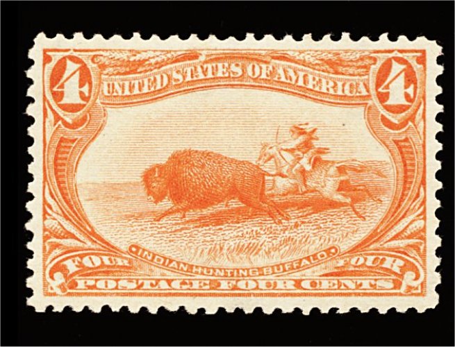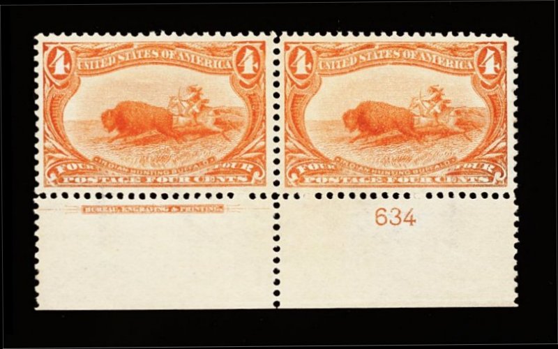 403 og 287 image#287, 4c Trans-Mississippi, bottom margin imprint and plate no. 634 pair, wonderfully fresh, with truly radiant color and a strong impression on bright paper, exceptionally well centered, o.g., l.h., extremely fine; a particularly handsome imprint and plate number pair. (Image) 350.00