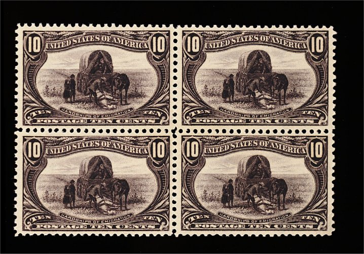 413 nhbl 290 image#290, 10c Trans-Mississippi, mint block of four, exceptionally well centered, strong rich color, o.g., n.h., bottom right stamp with tiny corner crease, otherwise very fine-extremely fine; an especially handsome block. (Image) 1,360.00+