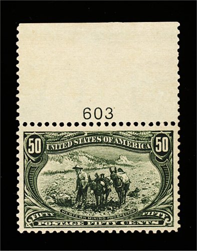 415 nh 291 image#291, 50c Trans-Mississippi, an eye-arresting full top sheet margin plate no. 603 single, possessing numerous outstanding physical characteristics, including a marvelous overall freshness few examples of this stamp ever display, plus its color is sumptuously rich and its impression is truly prooflike, however most impressive of all is this stamp's extravagantly large margins all around, and being marvelously well centered within them, pristine full o.g., never hinged, an extremely fine gem in every regard; to find this stamp well centered with margins this size is terribly challenging, to also find such a stamp never hinged is next to impossible; 1995 PF certificate. (Image) 1,300.00