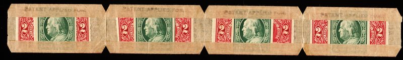 468 nh 343, 371 var. image#343, 371 vars., 1c Green and 2c Alaska-Yukon imperforates, an exceedingly scarce unsevered strip of four of U.S. Automatic Vending Co. pockets Ty. 2-1, numbered 240-243 on reverse, o.g., n.h., very fine; to find even a single example of this elusive pocket is an accomplishment, to find a strip of four is a major feat; 2000 PSE certificate; ex-Manthey. (Image) 5,000.00+