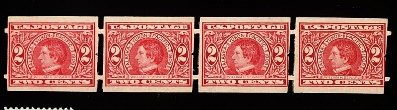 470 og 371 var. image#371 var., 2c Alaska-Yukon imperforate, Attleboro perforations, an enormously rare mint strip of four of this highly desirable private perforation, being in extraordinary quality for this normally frail item, wonderfully well centered, strong rich color, o.g., there are hinge reinforcements between stamps to ensure that the strip remains intact, extremely fine; an important showpiece for the private perforation specialist; 2000 PSE certificate; ex-Manthey. (Image) 4,800.00+