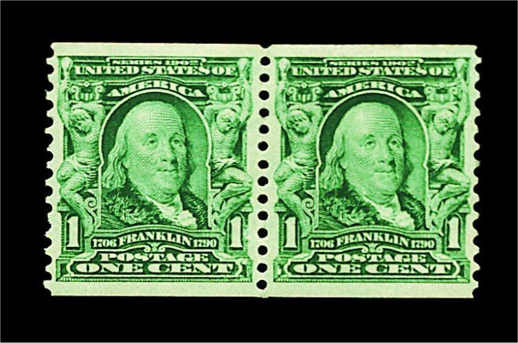 471 og 318 image#318, 1c Blue green coil, perf. 12 vert., a phenomenal quality mint pair, possessing essentially perfect centering which is virtually unheard of, as most genuine examples of this experimental coil are found quite off center, rich characteristic color and impression, o.g., relatively lightly hinged, extremely fine; unquestionably one of the very finest 1908 One Cent Blue Green horizontal coils in existence; 2001 PF certificate. (Image) 11,000.00