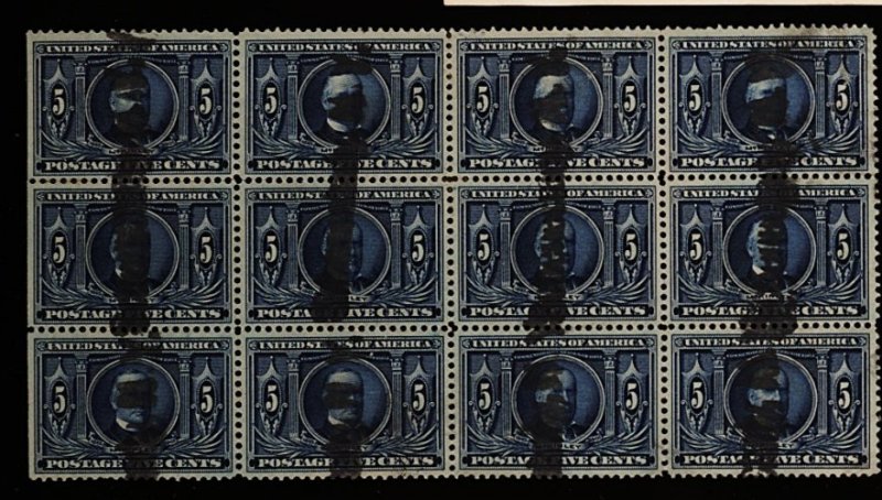 478 Obl 326 image#326, 5c Louisiana Purchase, an impressive used block of twelve (4 x 3), natural s.e. at left, extraordinarily well centered and margined throughout the block, deep luxuriant color, unusual roller bar cancels, stamps three and four in the top row with small faults, some minor hinge reinforced perf. separations, overall a very fine and unusually large used multiple, in fact, we have not seen a larger used multiple of this value. (Image) 450.00+