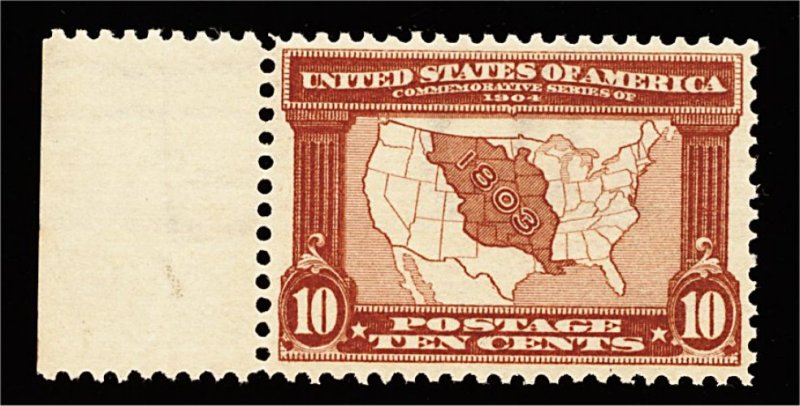 480 nh 327 image#327, 10c Louisiana Purchase, left sheet-margin single, virtually perfect centering, deep luxuriant color, unblemished o.g., n.h., extremely fine; a pristine gem; photocopy of a 2000 PF certificate for a block of four, this being the bottom left stamp. (Image) 325.00