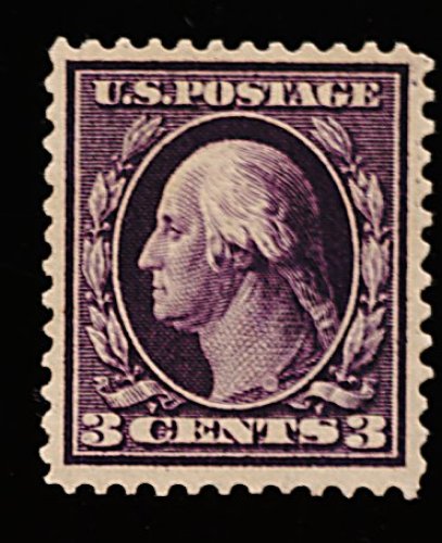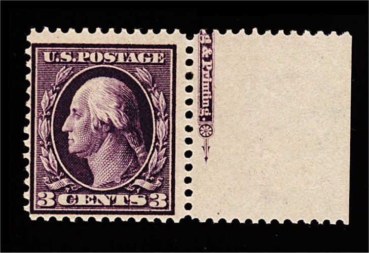 524 og 359 image#359, 3c Deep violet on bluish paper, an exceptionally fresh right sheet-margin partial imprint single, gorgeous intense color and a prooflike impression, full clean o.g., lightly hinged, fine; signed Stanley Gibbons and accompanied by a 1997 PSE certificate. (Image) 2,000.00