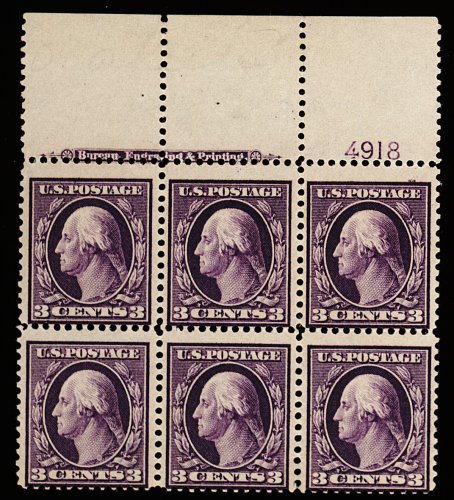 525 ogX 359 image#359, 3c Deep violet on bluish paper, an enormously rare full top margin imprint and plate no. 4918 block of six, quite fresh, deep luxuriant color, full clean o.g. with just the faintest trace of hinging, centered a bit to bottom with perforations just touching design, overall quite fine; probably no more than a half dozen Six Cent Bluish Paper plate blocks exist and this, according to our records, is one of only two full top plate blocks known; an important 20th century plate block; each stamp with very light Stanley Gibbons guarantee handstamp and accompanied by 1976 PF and 1994 PSE certificates. (Image) 22,500.00