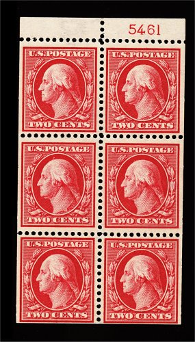 540 nhK 375a image#375a, 2c Carmine booklet pane of six, position D, showing plate no. 5461 in selvage, wonderfully well centered, brilliantly fresh, deep luxuriant color, o.g., n.h., extremely fine; a choice example of this highly collectable position; 2000 PF certificate. (Image) 225.00