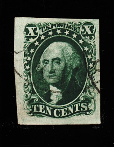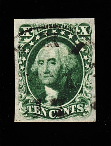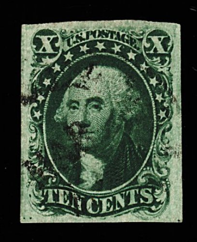 55 O 13 image#13, 10c Green, Ty. I, four large and wonderfully well balanced margins, deep luxuriant color that is far more intense than usual, deeply etched impression, light and unobtrusive town c.d.s., extremely fine; an especially scarce and desirable stamp in this premium condition; 1971 and 2000 PF certificates; ex-Sheriff. (Image) 800.00