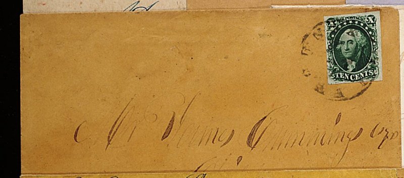 57 c 13 image#13, 10c Green, Ty. I, pos. 100R, showing double transfer, four full to mostly large margins, deep rich color and a sharp impression, tied by indistinct c.d.s. on 1857 cover to Niagra District, Canada West, Kingston and red Chippewa backstamps, very fine. (Image) Est. 500-750